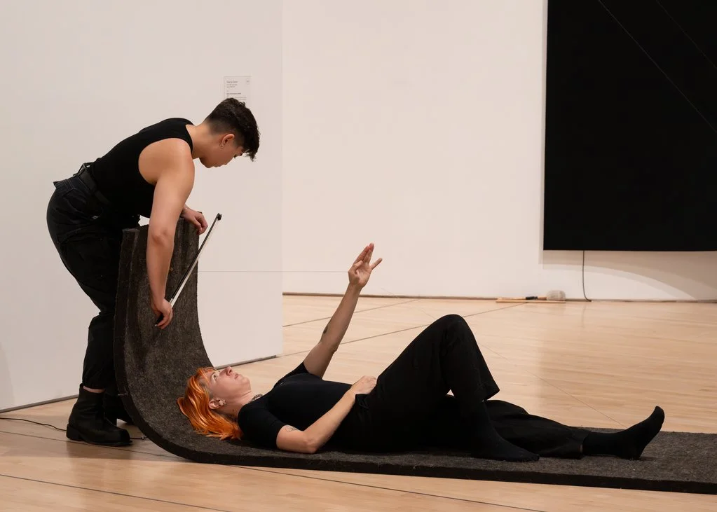 Dylan Edrich and Jenna Flohr performing on Naama Tsabar's Work on Felt (Variation 2), 2019 (in the exhibition What Matters: A Proposition in Eight Rooms, at the San Francisco Museum of Modern Art, July 20, 2023); © Naama Tsabar; photo: Tenari Tuatagaloa